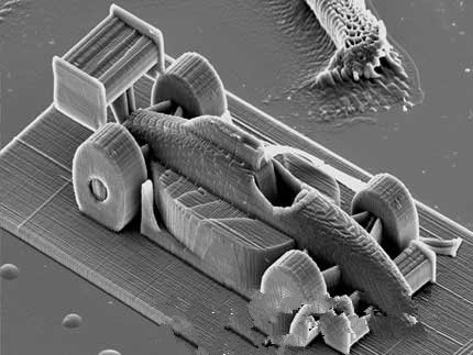 該賽車模型的尺寸僅有285μm,只比1英寸的1/100稍大一些,比人的頭發(fā)還要細。制作中使用了激光、激光鏡及特別配制的樹脂,具體方法是首先一點一點地準確注入樹脂,然后激活分子,最后用激光集中照射使其硬化成形。