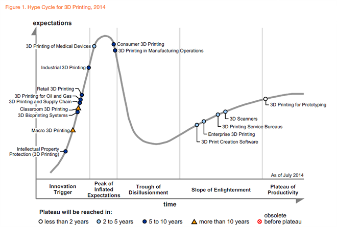 下面是Gartner公司制作的3D打印的“炒作周期”圖表: