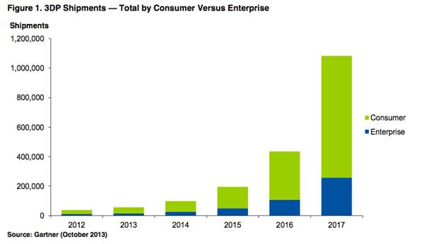 根據(jù)知名市場研究公司Gartner的最新預(yù)測,全球3D打印機(jī)(3DPS)的出貨量將從2014年的108151臺猛增至2015年的217350臺。2015年至2018年之間,全球3D打印機(jī)出貨量每年將增長一倍以上,到2018年達(dá)到230萬臺。