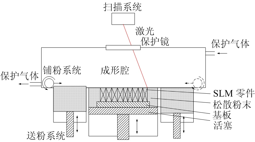 圖1中,根據(jù)成形件的三維CAD模型的分層切片信息,掃描系統(tǒng)(振鏡)控制激光束作用于待成形區(qū)域內(nèi)的粉末。一層掃描完畢后,活塞缸內(nèi)的活塞下降一個層厚距離;接著送粉系統(tǒng)輸送一定量的粉末,鋪粉系統(tǒng)的輥子鋪展一層厚的粉末沉積于已成形層之上。然后,重復(fù)上述兩個成形過程,直至所有三維CAD模型的切片層全部掃描完畢。這樣三維CAD模型經(jīng)逐層累積方式直接成形金屬零件。最后,活塞上推,從成形裝備中取出零件。至此,SLM金屬粉末直接成形金屬零件的全部過程結(jié)束。