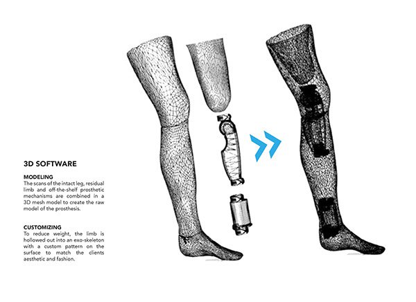 工業(yè)設(shè)計師William Root認(rèn)為,過時和有缺陷的工藝導(dǎo)致了當(dāng)下市場上價格高企和外形丑陋的假肢產(chǎn)品。而Root的Exo假腿設(shè)計,基于3D打印技術(shù),不僅為截肢者提供了一個低成本的解決方案,而且外形也很美觀。
