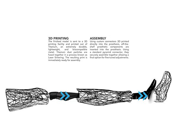 一旦最終設(shè)計方向確立后,該模型將作為一個單一的外骨骼部件輸入SLS 3D打印機,并使用鈦金屬打印出來。根據(jù)用戶的需求,最終的假肢使用連接器進(jìn)行組裝,以確保其在日常使用中更加舒適。為了減輕重量,假肢做成了網(wǎng)格的形式。網(wǎng)格的表面可以定制圖案和顏色,也可以套上硅膠套
