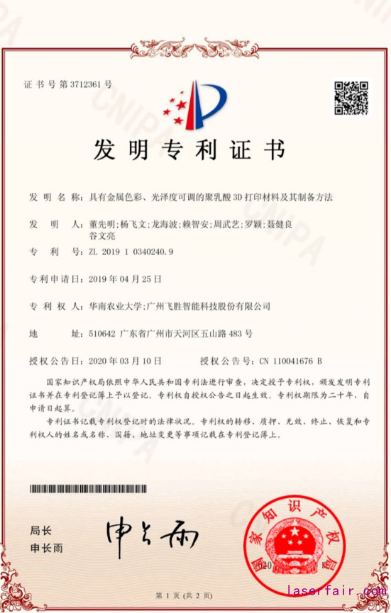 該研究成果發(fā)表在國際刊物Polymers, 同時獲得了中國授予專利權,授權公告號:CN110041676B。(F. W. Yang, J. H. Zeng, H. B. Long, J. L. Xiao, Y. Luo, J. Gu, W. Y. Zhou*, Y. Wei, X. M. Dong*. Micrometer Copper-Zinc Alloy Particles-Reinforced Wood Plastic Composites with High Gloss and Antibacterial Properties for 3D Printing[J]. Polymers, 2020, 12(3), 621. https://www.mdpi.com/journal/polymers/special_issues/advances_composite_polymers_3D_printing)