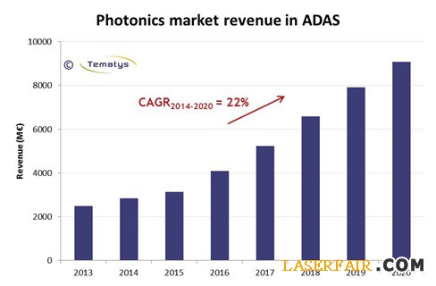 Photonics is an enabler of these functions. For example, sensorslike cameras, LIDARsor night vision systemsare or will be used for obstacles detection while Head-Up Displays (HUD) will be embedded in more and more cars to deliver the relevant information directly in the field-of-view of the driver. That's why, the EPIC-Tematys study expects the market of Photonics in ADAS togrow from around € 2.8b in 2014 to almost € 9 b in 2020 with a CAGR2014-2020 of around 22% [2]. Photonics companies should benefit from this trend.