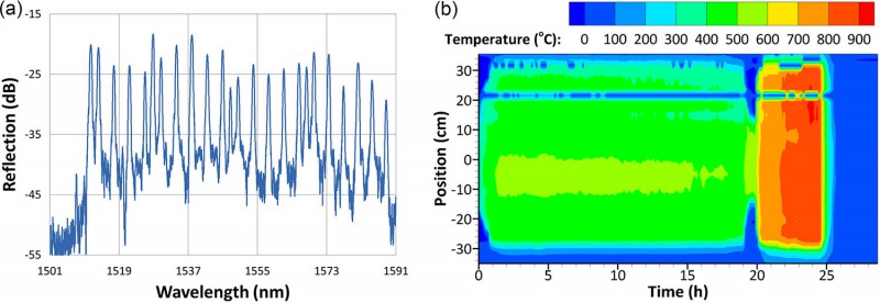We recently deployed the fs-IR technique at a site in Canada where a research organization is exploring the use of oxy-pressurized fluidized bed combustion for power generation.8 For optimal efficiency, this combustion process requires accurate measurements of temperature gradients within the combustor, and these measurements are difficult to realize using standard electronic thermocouple technology. At the research site, we deployed seven arrays containing 132 fs-IR laser-written type II FBG temperature sensors to the internal thermal gradients of the fluidized bed pilot combustor. Figure 2shows the reflection spectrum of one of the fiber arrays, as well as temperature mapping within the fluidized bed combustor as a function of position and time during part of one thermal cycle of the combustor. The sensor arrays performed well over five months through multiple thermal cycles of up to 1025°C. The advantages of this fiber optic deployment were clearly demonstrated with respect to cable management, ease of installation, high density of sensing points,' and more rapid response to thermal changes' compared with an electronic thermocouple approach.
