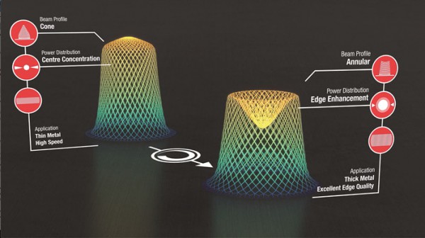 1) A Low Beam Parameter Product (BPP) mode profile, excellent for fast cutting of thin metals, especially bright highly reflective ones, but also for producing high speed high quality pierces in thick sheets. 2) A High BPP mode giving excellent, smooth cut edges at good speeds when cutting thick metal sheets, especially mild steel.