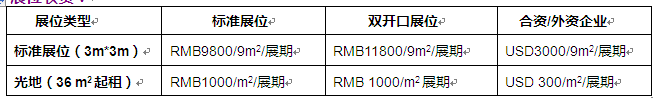 標(biāo)準(zhǔn)展位: (3M×3M)展位(包括三面圍板、楣板、一桌二椅、220V電源插座、清潔費(fèi)等)。