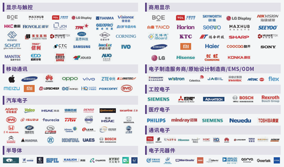 絲印耗材、油墨、高功能薄膜、鍍膜材料、蝕刻劑/光阻劑、導(dǎo)電薄膜、基板玻璃、車載玻璃、液晶材料、OLED發(fā)光材料、偏光片、彩色濾光片、OCA光學(xué)薄膜、背光源組件、驅(qū)動(dòng)IC等