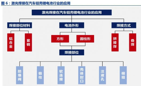 在動(dòng)力電池應(yīng)用方面,相比于傳統(tǒng)電弧焊、電阻焊等,激光焊接具有材料契合度高、 高效精密、自動(dòng)化集成的優(yōu)勢(shì)。激光焊接優(yōu)勢(shì)明顯。1) 材料契合度高:動(dòng)力電池殼體多為鋁材材質(zhì),更適合使用激光進(jìn)行焊接,激光焊接防止飛 濺和氣孔,有利于提升電池良品率及安全性能;2)高效精準(zhǔn):傳統(tǒng)的氬弧焊、電弧焊都是 通過(guò)接觸式焊接,降低了焊接速度,激光能量密度高,熱影響區(qū)變化范圍較小,屬于非接觸焊接,焊接速度快,加工精度高,變形?。?)自動(dòng)化集成:激光焊接系統(tǒng)具有高柔性, 與機(jī)器人聯(lián)合組成的焊接系統(tǒng)可以形成多功能的激光加工系統(tǒng),易實(shí)現(xiàn)自動(dòng)化生產(chǎn)。