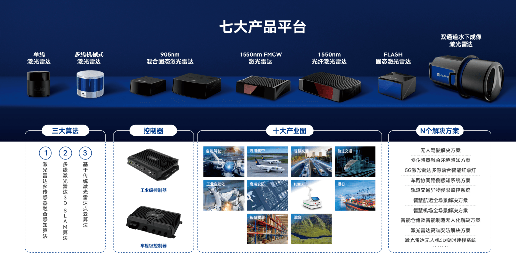 “我們公司的定位就是要‘軟硬結(jié)合’,持續(xù)走智能傳感器硬件加軟件算法系統(tǒng)及應(yīng)用解決方案、全測量原理、全技術(shù)路線、全應(yīng)用場景的覆蓋、全產(chǎn)業(yè)鏈深度集成這條路。目前,我們能向客戶提供十大應(yīng)用場景解決方案,分別是自動駕駛、智慧交通、軌道交通、通用航空、機器人、智慧物流、高端安防、港口、測繪及工業(yè)自動化?!焙〔ń榻B道。