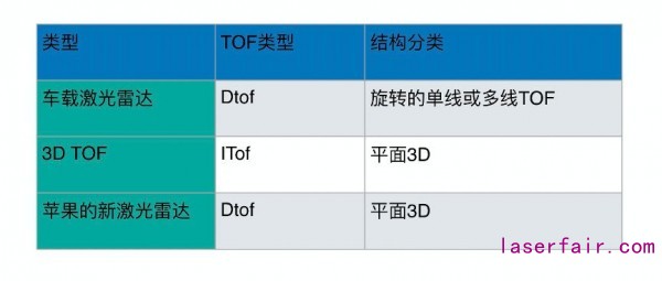 下面本文分析蘋果新的激光雷達(dá)和之前的手機(jī)3D TOF還有車載雷達(dá)有什么區(qū)別,有什么技術(shù)突破.首先三者的結(jié)構(gòu)實現(xiàn)和算法原理的區(qū)別可以參考下表: