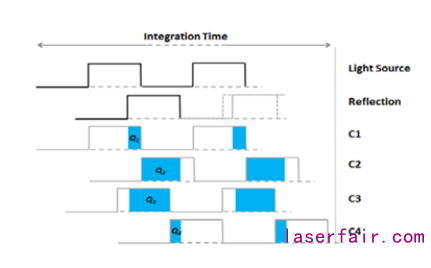 Itof和Dof在sensor和算法上的也有不小的區(qū)別. Itof目前更多是使用global shutter sensor 或者是在這個基礎(chǔ)上改進(jìn)的專用sensor.以原始的global shutter sensor 為例,最終的算法是使用基于正弦波的相位計算, 一般需要使用四幀圖像才能通過相位得到距離,而這導(dǎo)致了sensor不得不工作在4倍于3D成像的幀率,比如3D成像需要30fps,sensor就不得不工作在120fps.這導(dǎo)致了系統(tǒng)功耗的增加和幀率提升的困難.