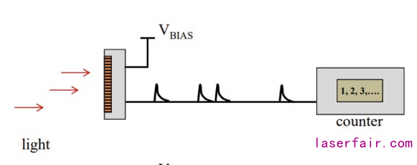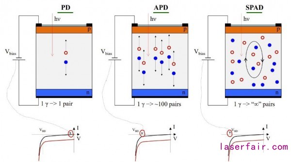 下圖左起第一個是一般成像使用的PD(光電二極管),第二是APD(雪崩二極管),第三個是SPAD(單光子雪崩二極管),其主要差別APD和SPAD在通過增加偏置電壓,在光子到光電二極管的時候會產(chǎn)生雪崩效應(yīng),就是產(chǎn)生大量的電子.這對成像不利,但是對于檢測脈沖則很好.而SPAD比PAD更敏感,也就是只需要很少的光子就能產(chǎn)生雪崩效應(yīng).