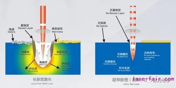 激光表切的工藝,我們可以理解為激光打標(biāo)機(jī)的原理,只是更換成了皮秒激光器或者飛秒激光器而已,還有必須加振鏡,一層一層掃下去的材料,有一定的錐度和崩邊(錐度一般<13°,且視材料厚度來(lái)定,崩邊一般<30μm);