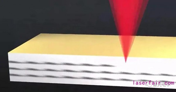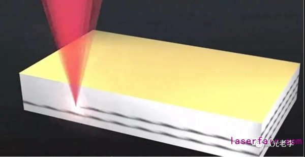 激光隱形切割是運(yùn)用多光子吸收的光學(xué)損傷現(xiàn)象來(lái)完成切割,當(dāng)激光掃描在透明材料中間位置時(shí),聚焦在材料內(nèi)部的激光強(qiáng)度迅速增強(qiáng)材料即被加工,從而在材料內(nèi)部形成一個(gè)改質(zhì)層(也有叫SD 層),使材料由結(jié)構(gòu)緊湊、結(jié)合緊密的不易于分?jǐn)嗟恼w改變成結(jié)合松散、易于分?jǐn)嗟拇嗾w(有的叫打破分子鍵),所以有的叫激光改質(zhì),再用裂片機(jī)將透明材料裂開(kāi)即可。