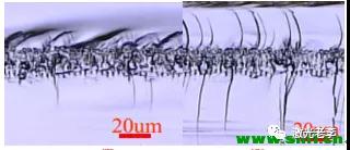 而激光隱形切割,則完美的解決了如上問(wèn)題,全干式制程,無(wú)需清洗,切割道控制在幾個(gè)μm以?xún)?nèi),崩邊也控制在幾個(gè)μm以?xún)?nèi),速度是傳統(tǒng)刀輪切割的20倍以上,這就是技術(shù)的完美替代。美中不足的就是采用激光隱切工藝,無(wú)法滿足厚片制程,1mm以上的就不要考慮激光隱切了,另外,激光隱切工藝對(duì)材料表面的粗糙度也有一定的要求,粗糙度越高,越會(huì)對(duì)激光隱切產(chǎn)生漫反射,粗糙度越低,越對(duì)激光隱切越有利。下圖粗糙度Ra<0.07μm與Ra>0.07μm硅片切割后的Si片切割效果對(duì)比,請(qǐng)仔細(xì)看右面粗糙度大的效果,是不是特別差。