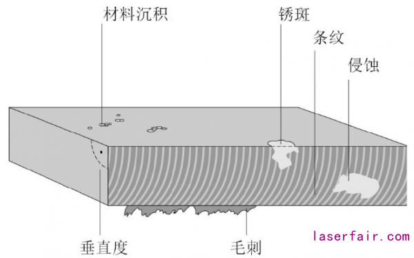 有許多判定激光切割邊緣質(zhì)量的標準。像毛刺形式、凹陷、紋路等標準可以用肉眼判定;垂直度、粗糙度和切口寬度等則需要采用專用儀器來測量。材料沉積、腐蝕、熱影響區(qū)域和變形也是衡量激光切割質(zhì)量的重要因素。