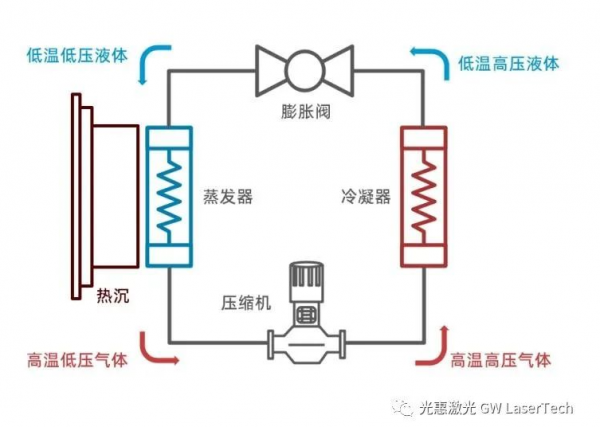 壓縮機(jī)制冷散熱原理:壓縮機(jī)壓縮冷媒,使冷媒變成高溫高壓的氣體,并流向外部冷凝器。高溫高壓氣體冷凝成低溫高壓的液體,液化產(chǎn)生的熱量隨風(fēng)扇排出機(jī)器外。低溫高壓的液體冷媒通過膨脹閥降壓后變成低溫低壓易蒸發(fā)的狀態(tài),并流向內(nèi)部蒸發(fā)器。蒸發(fā)器吸收熱量,使激光器內(nèi)部溫度降低,達(dá)到降溫的效果,然后冷媒汽化成高溫低壓的氣體。經(jīng)蒸發(fā)器蒸發(fā)后的氣體冷媒再次被壓縮機(jī)壓縮,往復(fù)循環(huán),便實(shí)現(xiàn)了機(jī)器內(nèi)部的散熱。