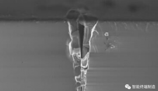 表面燒蝕切割是較為普遍的激光切割工藝,其原理是將激光聚焦于所需材料的表面,聚焦的地方吸收激光能量后形成去除性的融化和蒸發(fā),在切割表面形成一定深度的"V"型口,然后通過(guò)外部施加壓力使芯片分開(kāi)。切割完后的"V"型槽如圖3所示: