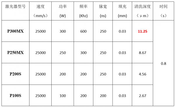 如表3所示,四款激光器在其最佳光學參數條件下清洗后樣件照片,樣色依次由深入淺,樣件清洗深度也逐漸降低。因為光斑搭接率的減小,其它三款激光器清洗后樣件表面出現明顯的激光掃描痕跡,而P300MX激光器的高平均功率和光束質量使其可以在保證光斑搭接率的同時獲得更大數值的單光斑能量密度,從而提高清洗效率和清洗深度。