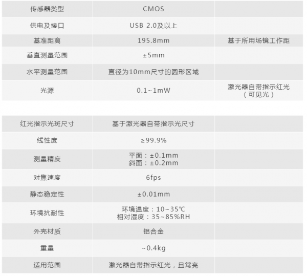 焦點(diǎn)監(jiān)控的工作原理:采用設(shè)備激光器自帶指示紅光,使用相機(jī)接收在樣品上反射光的圖像信息,然后通過圖像處理,對光斑位置及相對激光焦點(diǎn)的垂直軸偏移量進(jìn)行校正,得到線性關(guān)系,從而實(shí)現(xiàn)快捷焦點(diǎn)監(jiān)控和校正的功能。焦點(diǎn)模塊的核心技術(shù)指標(biāo)如下表1所示: