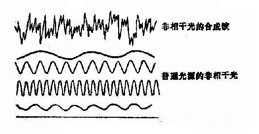 一般光源發(fā)射出來的光是非相干光,它是波長(zhǎng)不等、雜亂無序的混合光束。由于非相干光的波長(zhǎng)、相位、振幅極不一致。因此它們的合成波也是一條雜亂無章、毫無規(guī)律的曲線(圖4-26-1),從中不易找出它的周期性來。普通光源如日光、燈光等所輻射的就是這非相干光線。