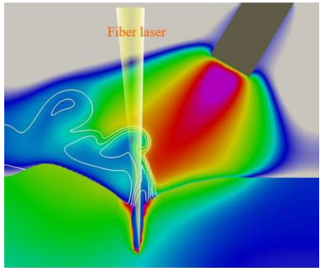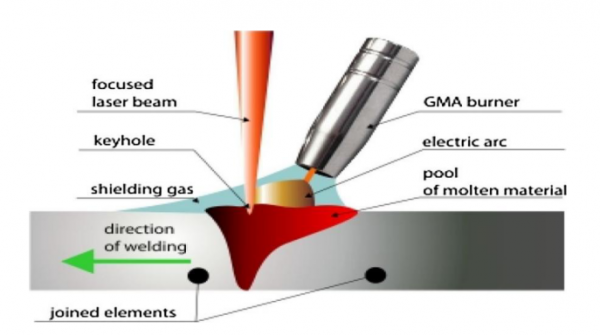 激光焊接因熱影響區(qū)非常窄,其激光束可以聚焦在很小的區(qū)域上,產(chǎn)生狹窄而深的焊縫而著稱,能夠?qū)崿F(xiàn)更高的焊接速度,從而減少了熱量輸入并降低了焊接零件的熱變形幾率。然而,激光焊接的縫隙橋接能力差,因此在工件裝配和邊緣準(zhǔn)備中要求很高的進(jìn)動(dòng)[1]。激光焊接對(duì)于鋁,銅,金等高反射率材料焊接也非常困難。與此相反,電弧焊工藝具有出色的間隙橋接能力,高電效率,并且可以有效地焊接具有高反射率的材料。但是,電弧焊過程中的低能量密度會(huì)使該過程變慢,從而在焊接區(qū)域產(chǎn)生大量的熱量輸入,并導(dǎo)致焊接零件的熱變形。因此使用高功率激光束進(jìn)行深熔焊的同時(shí)使用具有高能量效率的電弧協(xié)同作用于焊接[2](如圖2),混合效應(yīng)彌補(bǔ)了工藝的缺陷,并補(bǔ)充了其優(yōu)勢。
