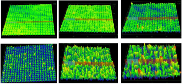 研究了激光能量密度對(duì)表面形貌的影響規(guī)律,優(yōu)化了激光平均功率對(duì)微織構(gòu)排列的工藝參數(shù)。圖1.8為不同能量密度對(duì)鎂合金表面形貌的影響,從三維形貌圖中可以觀察到,當(dāng)能量密度為0.956J/cm2和1.611J/cm2時(shí),激光已開(kāi)始對(duì)鎂合金基體產(chǎn)生刻蝕效果,其中微織構(gòu)并沒(méi)有形成很深的凹槽,這是由于激光能量密度過(guò)小,無(wú)法在鎂合金表面形成一定深度;當(dāng)能量密度提升到2.433J/cm2和3.389J/cm2時(shí),表面形成高度不一的微織構(gòu)呈一定周期性排列,且局部受熱影響產(chǎn)生堆積現(xiàn)象,在激光加工過(guò)程中金屬液滴的飛濺有利于微納米顆粒物的產(chǎn)生;當(dāng)能量密度達(dá)到4.445J/cm2和5.58J/cm2時(shí),表面受到了較為嚴(yán)重的熱影響,幾乎全表面發(fā)生重熔現(xiàn)象,加工的微織構(gòu)呈不規(guī)則狀排列。由此可知,當(dāng)能量密度在2.433~3.389J/cm2時(shí),最適合周期性微織構(gòu)的構(gòu)建。