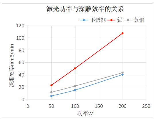 激光可以在鋼、鋁、銅等金屬進行深度雕刻,如果不考慮效率,不論多少深度都是可以實現(xiàn)的。但是實際生產中,由于生產節(jié)拍的要求,往往對效率的要求都會比較高。功率越高效率越快,設備成本也會越高。根據(jù)需要,選擇合適的功率進行深雕,讓設備具有最佳性價比。我們使用GLE不同功率激光器對不銹鋼、鋁、銅進行了深雕效率對比,獲得了以下激光功率與深雕效率的關系圖。