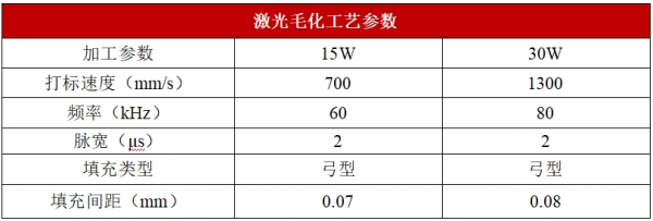 我們在加工毛化效果一致的情況下,分別采用15W和30W兩款不同功率的激光器進(jìn)行毛化效率的對比,根據(jù)測試結(jié)果可見,采用高功率激光器的毛化效率更高,30W激光器相比15W激光器效率提高158%,且30W激光器具有更大的單脈沖能量,在進(jìn)行加工時(shí)可以提高輸出頻率,繼而提高加工速度,因此在玻璃毛化應(yīng)用上效率更高,更具性價(jià)比。