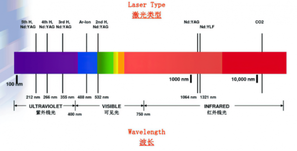 激光器的波長可以從紫外到紅外(如圖1),目前工業(yè)上常用的有UV激光器、可見光激光器、IR激光器、CO2激光器等。激光器按脈沖長度可以分為:連續(xù)激光器、準(zhǔn)連續(xù)激光器、納秒激光器、皮秒激光器,飛秒激光器等。不同類型激光與材料作用的機(jī)理和效果有很大差別。