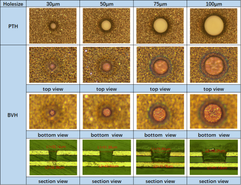 UV激光鉆孔主要特點(diǎn):以光化學(xué)燒蝕為主,熱燒蝕的反應(yīng)很少,產(chǎn)生的碳化物也很少,孔化前清理非常簡單;能直接去除銅,可以直接進(jìn)行鉆孔,鉆孔前不需要對銅做前處理;目前,常用的幾款UV激光鉆孔機(jī)能鉆的孔最小尺寸為25μm。