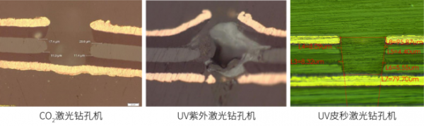 由于基材對不同波長的激光吸收差異很大,因此,使用什么波長的激光鉆孔機(jī)主要取決于介電層的材料:介電層只有樹脂基板使用UV激光鉆孔機(jī),介電層中有玻纖基板使用CO2激光鉆孔機(jī)。