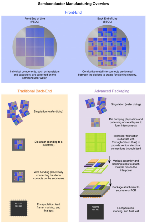 半導體制造通常分為前段與后段制程。前段又進一步細分為“前道工序“和后道工序“。這說明了前段與后端加工的主要步驟,并強調(diào)了后段生產(chǎn)中眾多新型先進封裝方法之一的額外復雜性。