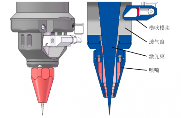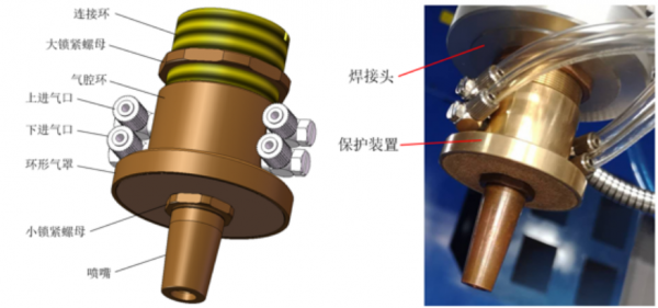 氣體保護是影響焊接質量的一個重要因素,良好的氣體保護不僅可以減少焊接飛濺,還可提高焊縫光潔度。常規(guī)同軸吹氣保護方式如圖4.1所示,焊接頭最下端安裝有一個單層或雙層銅噴嘴,上方設置有橫吹模塊進行飛濺防護,噴嘴通過外接保護氣向焊接熔池施加保護,該方式不足之處在于保護氣易卷入空氣,無法起到很好的氣體保護效果。