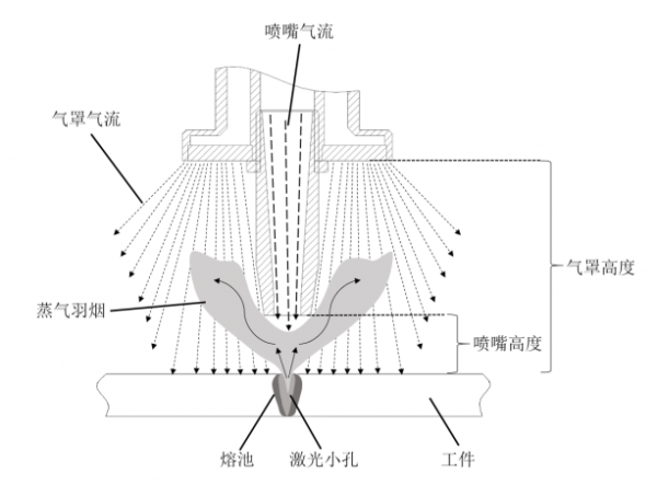 上進氣口和下進氣口均通入焊接保護氣,氣體通入后可形成多路氣流,分別為排空氣流、噴嘴氣流和氣罩氣流。裝置的應用原理如圖4.3所示,噴嘴氣流向下方噴射,對從小孔中噴射出來的蒸氣羽煙在中心區(qū)域進行壓制,通過抑制蒸氣羽煙在激光束入射路徑上的噴射高度,可減少其對激光束的干擾,提高焊縫成形的均勻性并保證焊縫熔深,同時,噴嘴氣流還可對熔池局部進行氣體保護,噴嘴氣流壓力需適中,壓力過小則無法抑制蒸氣羽煙的高度,入射激光束受蒸氣羽煙的干擾大,熔池及小孔穩(wěn)定性差;壓力過大則會將蒸氣羽煙壓制于工件表面,造成工件表面黑色煙塵附著,影響工件清潔度,甚至造成焊縫凹陷;氣罩氣流從較高處噴出,具有較大的噴氣面積,可較好的排除熔池周圍的空氣,但需要注意的是,氣罩氣流壓力需適中,既要保證排空效果避免焊縫氧化過大,又要利于蒸氣羽煙向上擴散不附著于工件。