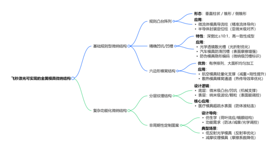 飛秒激光在金屬模具表面制造納米級功能紋理方面獨(dú)具優(yōu)勢,能精確“雕刻”出你想象的任何復(fù)雜形貌,如凸點(diǎn)凸臺、凹槽凹坑、六邊形蜂窩等: