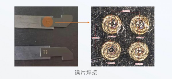 寶辰鑫以風冷QCW激光器150/1500W為核心光源,并配備專業(yè)的振鏡頭和控制系統(tǒng)等,為客戶搭載了一站式的QCW準連續(xù)精密應(yīng)用解決方案。在實際焊接應(yīng)用中,無論是疊焊到鍍鎳銅上,還是疊焊到鋁上,均可觀測到焊接外觀較好,無氣孔炸點,背面無焊穿,拉力>1.5kgf,滿足客戶要求。