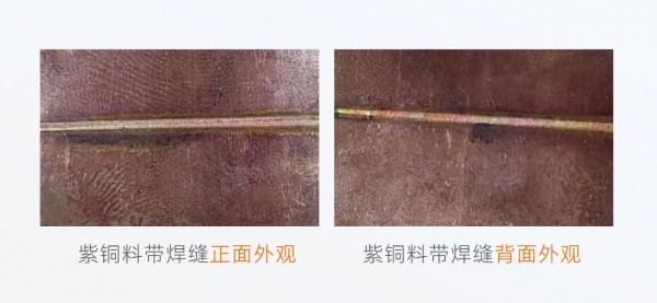 在某項目中,需要將0.15mm紫銅料帶拼焊到一起,雙面成型。寶辰鑫為客戶提供了以風冷QCW激光器150/1500為核心光源的焊接方案,并采用脈沖模式進行焊接,峰值功率高,熱輸入小,避免了連續(xù)焊接下持續(xù)熱輸入過大時材料容易焊穿、功率不夠又無法焊上的問題,實現(xiàn)了對薄材高反材料紫銅的穩(wěn)定焊接,焊接效果滿足客戶加工要求,拉力達到853N。
