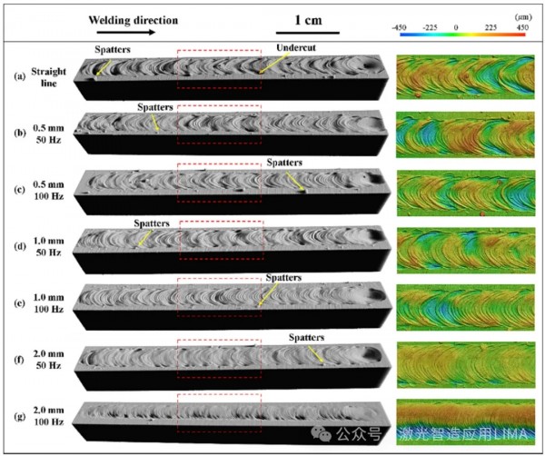(1) 不同的激光振蕩模式對(duì)焊縫表面有明顯的影響。較高的振幅和頻率可以改善表面質(zhì)量,而過大的振蕩參數(shù)可能會(huì)增加粗糙度并產(chǎn)生凹形缺陷。