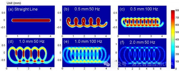 激光能量密度最大出現(xiàn)在軌跡重合處。對(duì)比下圖圖(b、d)和圖 (c、e)可知,掃描頻率的增加會(huì)增大沿掃描路徑的軌跡重合面積,使激光能量分布更加均勻。然而,最大能量密度的減小會(huì)導(dǎo)致焊縫深度的減小。