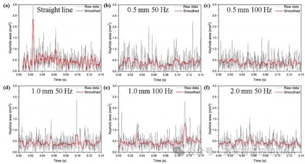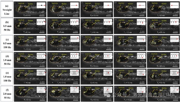 為闡明掃描路徑對(duì)熔池行為的影響,采用高速攝像系統(tǒng)對(duì)熔池和鎖孔的演變過程進(jìn)行了觀察。下圖圖(a)示出了直線路徑下熔池的演化過程。圖(b-f)為不同振蕩參數(shù)下熔池的演化圖。隨著振蕩頻率和振幅的增加,熔池后部由于熔池寬度的擴(kuò)大而變得更加圓潤(rùn)。隨著熔池長(zhǎng)度的增加,鎖孔噴發(fā)引起的表面波動(dòng)在后向傳播過程中減小。因此,熔化的液態(tài)金屬在熔池后端平滑而有規(guī)律地凝固,形成均勻致密的焊縫魚鱗。