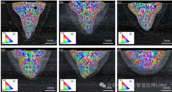 下圖顯示了不同振蕩頻率和振幅下焊縫截面的EBSD形貌。在激光焊縫熔合線附近,柱狀枝晶晶粒向焊縫中心生長(zhǎng)。如圖(a)所示,在“杯腹”和“杯莖”區(qū)域之間,可以觀察到明顯的柱狀顆粒分布差異。柱狀晶粒沿“杯腹”壁呈u型分布,而在“杯莖”區(qū),柱狀晶粒沿熔合線呈u型分布。在焊縫凝固過程中,熔合區(qū)部分凝固的晶粒作為凝固前沿進(jìn)行形核,并優(yōu)先沿最大溫度梯度方向垂直于熔池邊界生長(zhǎng)。這種現(xiàn)象的發(fā)生是由于激光的高功率密度,導(dǎo)致焊接池內(nèi)部過熱。較高的熱梯度G和中等的生長(zhǎng)速率R使得G/R大于組織轉(zhuǎn)變的閾值,導(dǎo)致柱狀晶粒的形成。焊縫中心溫度梯度G減小,導(dǎo)致G/R比逐漸降至組織轉(zhuǎn)變閾值以下,向等軸晶過渡。等軸晶粒均位于“杯腹”和“杯莖”的中心部位。由于焊縫的“杯莖”較窄且靠近基體,因此在冷卻過程中,在“杯腹”區(qū)域之前完全凝固。凝固后的“杯莖”部分作為“杯腹”底部的成核部位,促進(jìn)柱狀晶粒向上生長(zhǎng)。