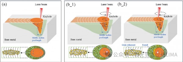 下圖顯示了直線和振蕩焊接過程所示,激光振蕩焊接中激光束的位置不斷變化,會(huì)增加中間熔池長(zhǎng)度,使已經(jīng)凝固的金屬重新熔化,導(dǎo)致晶粒生長(zhǎng)速率r降低??蓪?dǎo)致下等軸晶區(qū)G/R的降低。