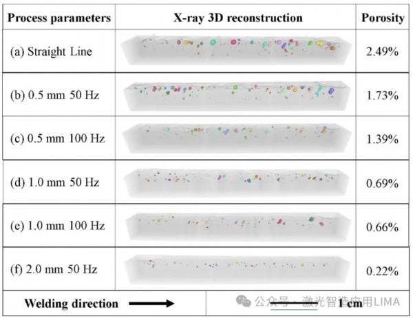 三維x射線斷層掃描對(duì)焊縫進(jìn)行了全面檢查,獲得了焊縫內(nèi)氣孔的三維分布,如下圖所示??紫堵实挠?jì)算方法為氣孔的總體積除以焊縫的總體積。通過對(duì)直線激光振蕩焊和圓形激光振蕩焊焊縫孔隙形態(tài)和分布的比較,發(fā)現(xiàn)直線激光振蕩焊焊縫中含有較多的大體積孔隙,孔隙率為2.49%,顯著高于圓形激光振蕩焊焊縫。通過圖(b、c)和圖(d、e)的對(duì)比可以看出,增加振蕩頻率有助于抑制孔隙的形成。對(duì)比圖(b、d)和圖(c、e)可以看出,振蕩幅度的增大對(duì)孔隙形成的抑制也有很大作用。當(dāng)振蕩幅度進(jìn)一步增大到2mm時(shí)(圖(f)),孔隙率進(jìn)一步降低到0.22%,只剩下小體積和小孔隙。