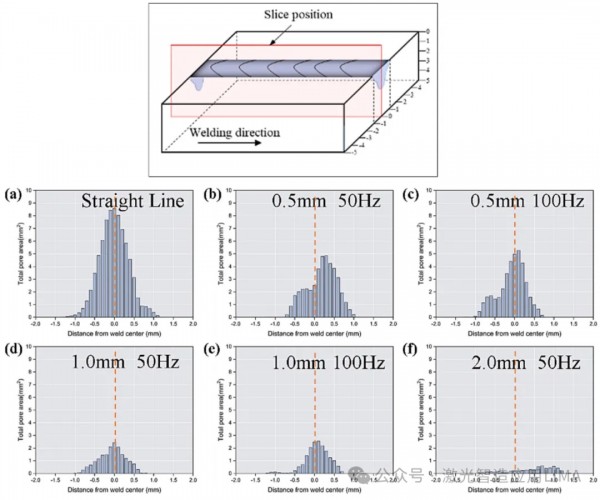 下圖描繪了距焊縫中心線不同距離處的孔隙面積分布,表示了基于孔隙面積大小的孔隙率。對(duì)于直線焊接,氣孔面積沿焊縫中心線呈對(duì)稱分布,隨著離焊縫中心線距離的增加,氣孔面積逐漸減小。結(jié)果表明,鎖孔誘發(fā)的氣孔主要集中在焊縫中心線熔池后壁后方。對(duì)于激光振蕩焊接,孔分布的對(duì)稱性變?nèi)酢?br/>