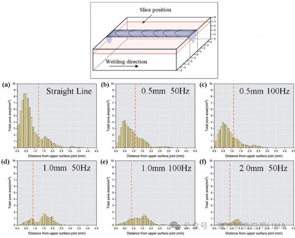 下圖顯示了距離焊縫表面不同距離處的孔隙面積,其中紅線表示“杯腹”和“杯干”區(qū)域的邊界。在大孔隙占主導(dǎo)地位的情況下(圖(a-c)),邊界以上的孔隙面積占85%以上。這是因?yàn)榭v向邊界處的輪廓過渡更容易捕獲焊縫池中的氣泡,并且捕獲的氣泡在浮力的影響下有向上遷移的趨勢(shì)。在以小孔隙為主的情況下(圖(d-f)),孔隙集中在邊界線以下0.5 mm范圍內(nèi)的區(qū)域內(nèi)。冷卻時(shí)間短,向上位移小可能是造成這種現(xiàn)象的原因。