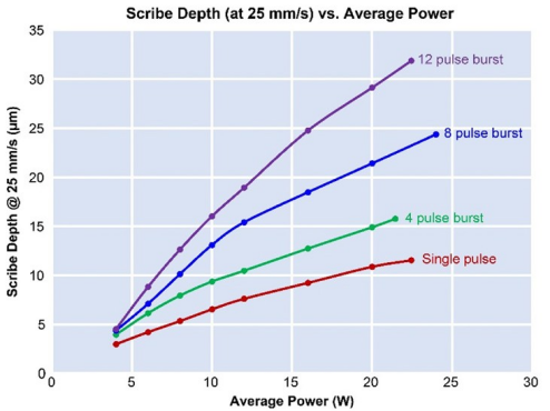 圖 1. 單脈沖和各種脈沖串配置(4-12 個脈沖串子脈沖)在 25 mm/s 凈速度下的劃線深度與功率的函數(shù)關系。顯然,脈沖串提高了燒蝕率。