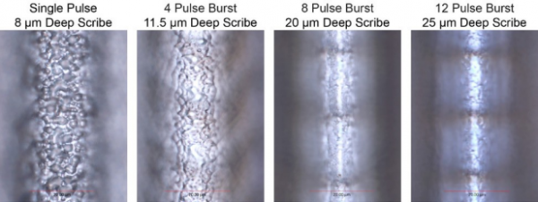為了對劃線進行定性評估,我們拍攝了一系列照片。這些照片如圖2所示。具體來說,這些照片是利用1、4、8和12 個脈沖串制作的一系列25 μm 深溝槽的圖像,在每種情況下,雷射平均功率和凈速度都經過調整,以達到最佳質量(25μm深度)。