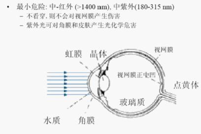不同波譜的激光對(duì)身體器官的影響不同,近紅外和可見光可直達(dá)視網(wǎng)膜,可直達(dá)視網(wǎng)膜,對(duì)視覺神經(jīng)造成不可恢復(fù)傷害。: